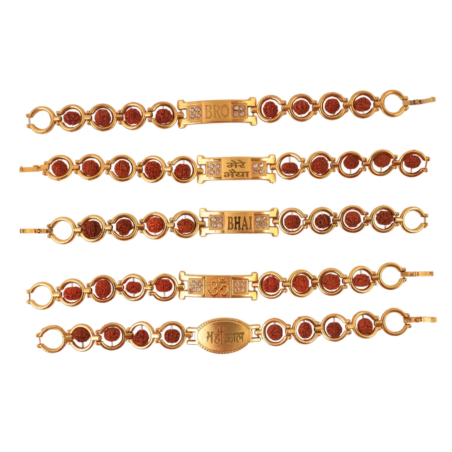 Gold Plated Designer Circular Bead Bracelet Rakhi for Brother – 1 Pc Mixed Assorted Rakhi with Traditional Red Beads & Ornamental Chain – Elegant Imitation Metal Raksha Bandhan Rakhi for Men & Boys