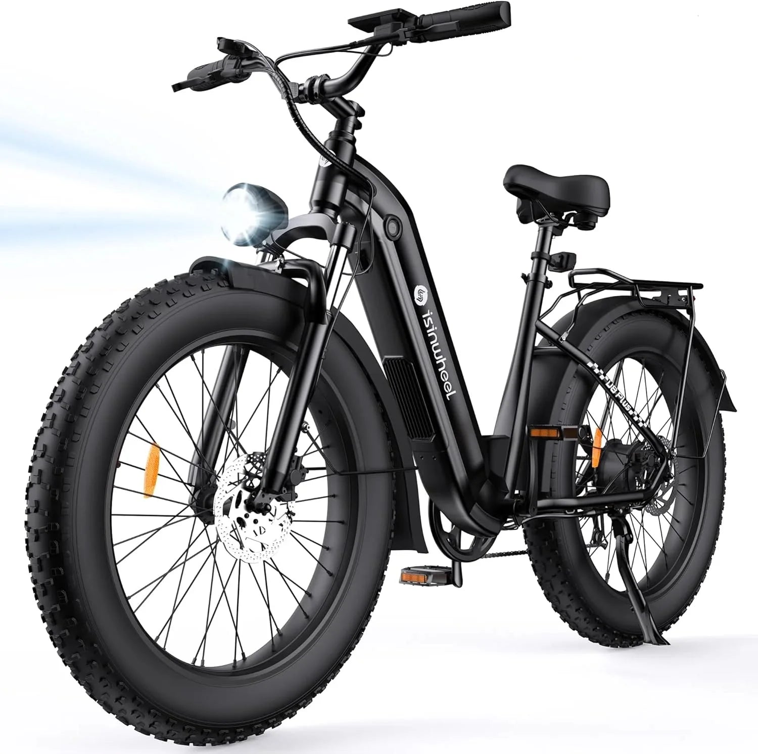 • Le vélo de montagne électrique tout Terrain Fat-Tire Beast-U8 Plus est équipé de pneus anti crevaison de 26" x 4,0 " avec des couches 3X résistantes à l'usure et des rainures de drainage (testés à 5000 miles).La suspension complète, les engrenages à 7 vitesses, les lumières de 2000 lm et les deux disques mécaniques conquièrent n'importe quel terrain en toute sécurité.