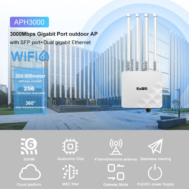 APH3000 a 4x 6dBi 2.Antennes Wi-Fi 4G/5G..Prend en charge la couverture complète à 360 degrés des signaux Wifi.En raison de l'absence d'interférence, la distance de transmission maximale peut atteindre 300 à 500 mètres.Des indicateurs sans fil haute performance peuvent obtenir une plus grande zone de couverture sans fil et de meilleures performances de pénétration des murs.