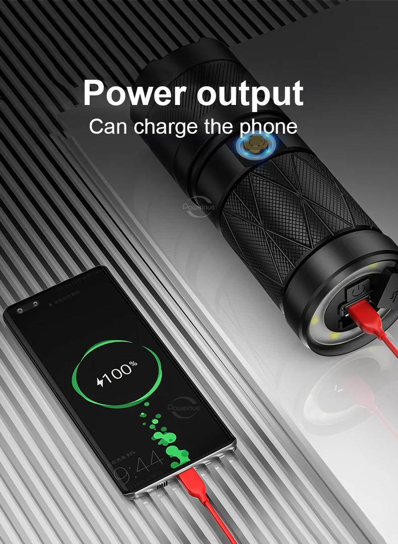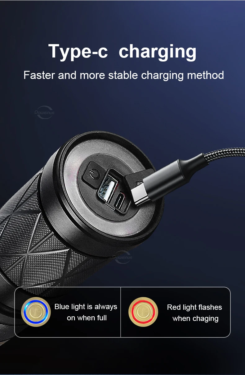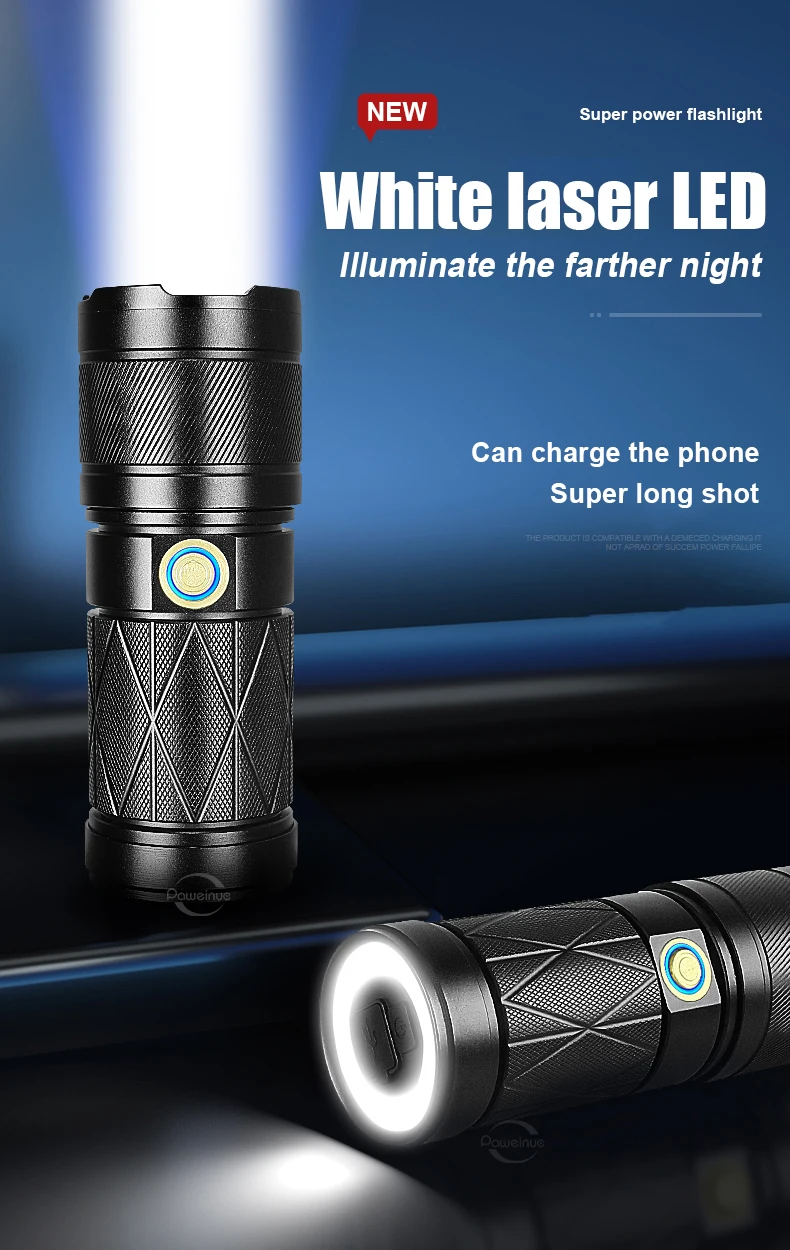 La lampe de poche utilise une mèche LED laser blanche comme point d'émission de lumière, et la distance d'irradiation la plus longue peut atteindre 1 500 mètres.Il existe 5 modes d'éclairage principaux.Le feu arrière COB dispose d'un interrupteur indépendant.Le COB peut être utilisé en continu pendant 48 heures.La lampe de poche dispose d'une batterie 3*18650 intégrée jusqu'à 12 000 mAh, il n'est donc pas nécessaire d'acheter des piles supplémentaires.Il dispose d'un affichage de puissance – lumière verte (pleine puissance) et lumière rouge (faible puissance).Vous pouvez connaître la puissance restante à tout moment.C'est votre meilleur choix pour l'éclairage extérieur et quotidien.C'est également un excellent cadeau.