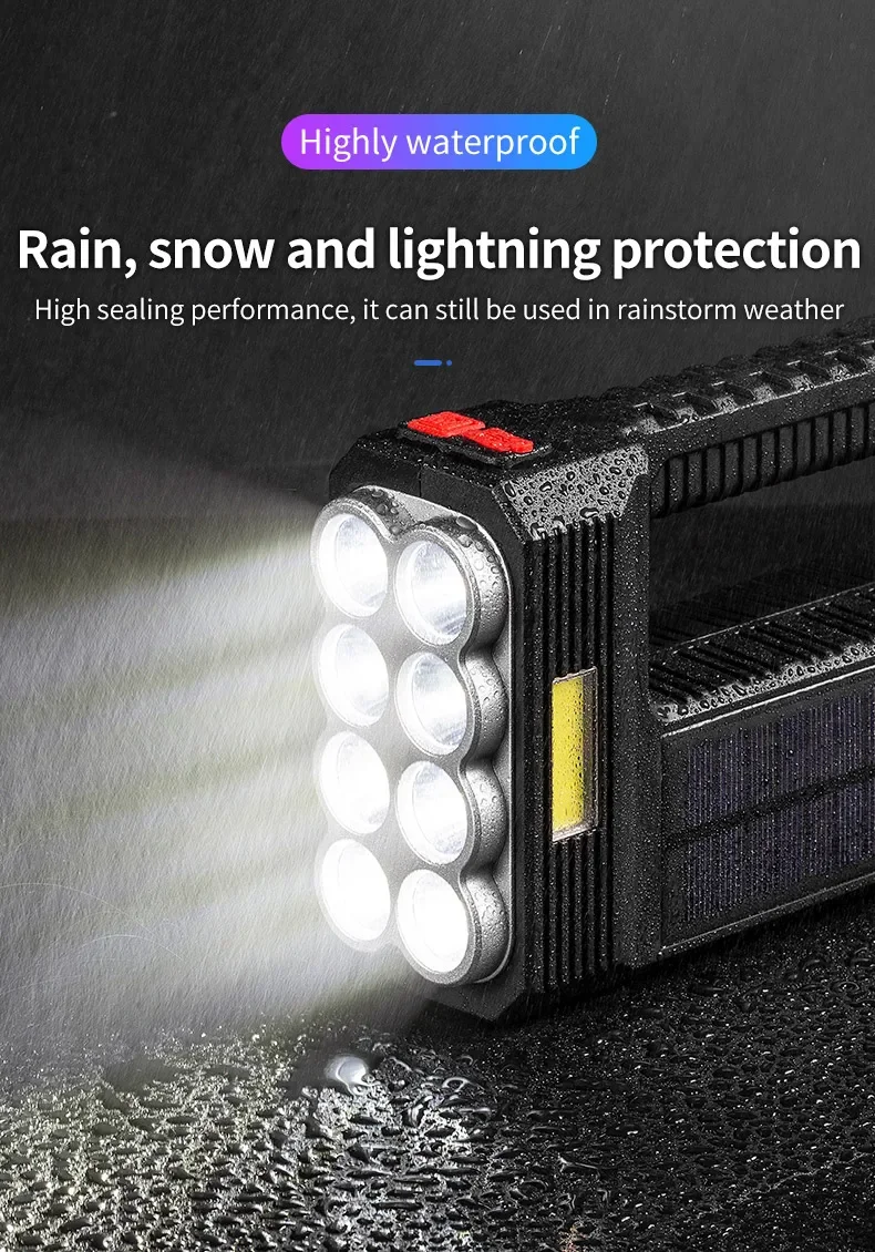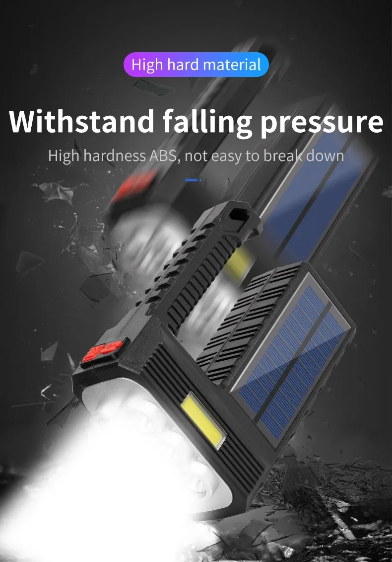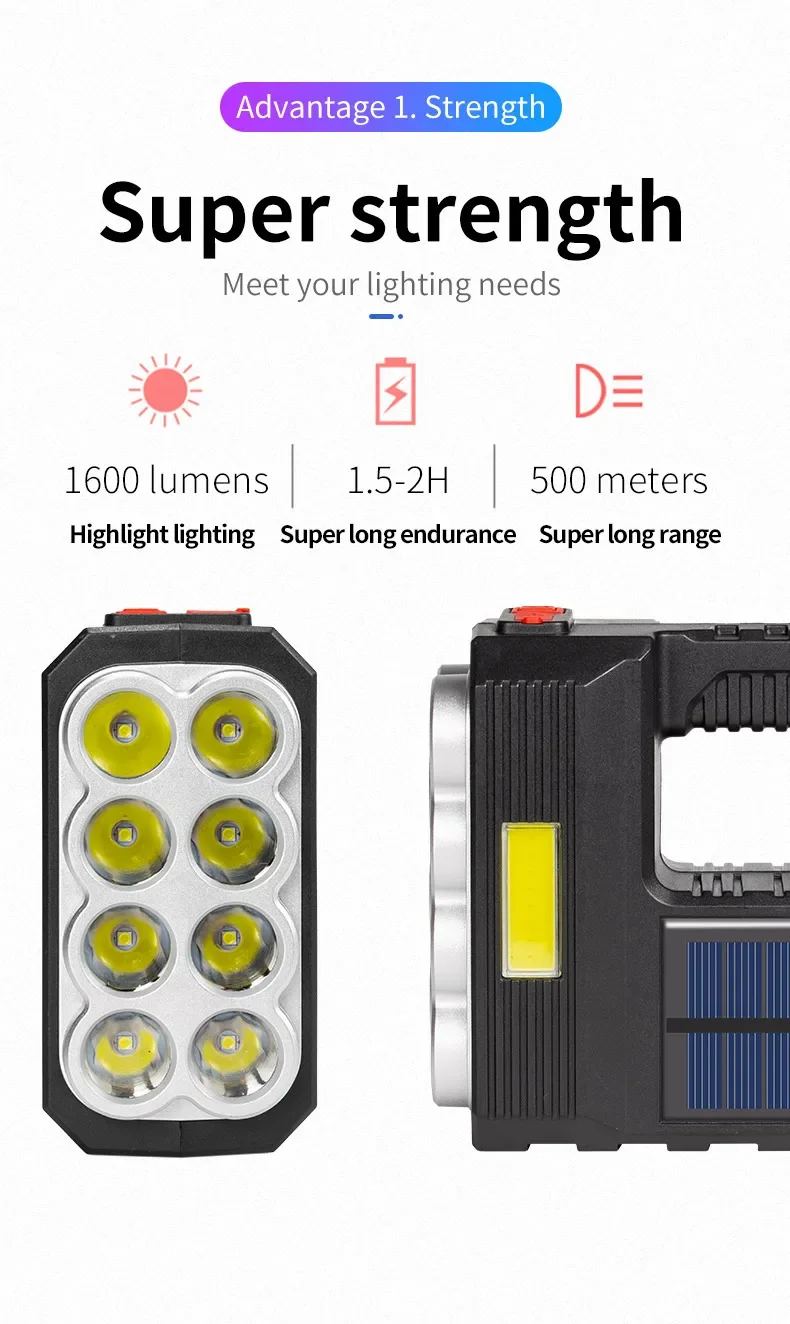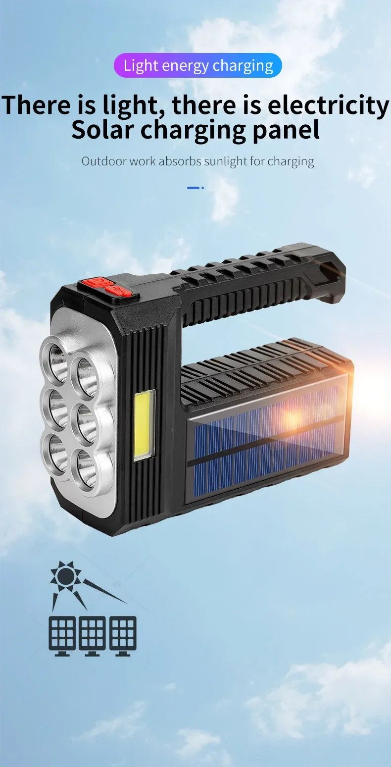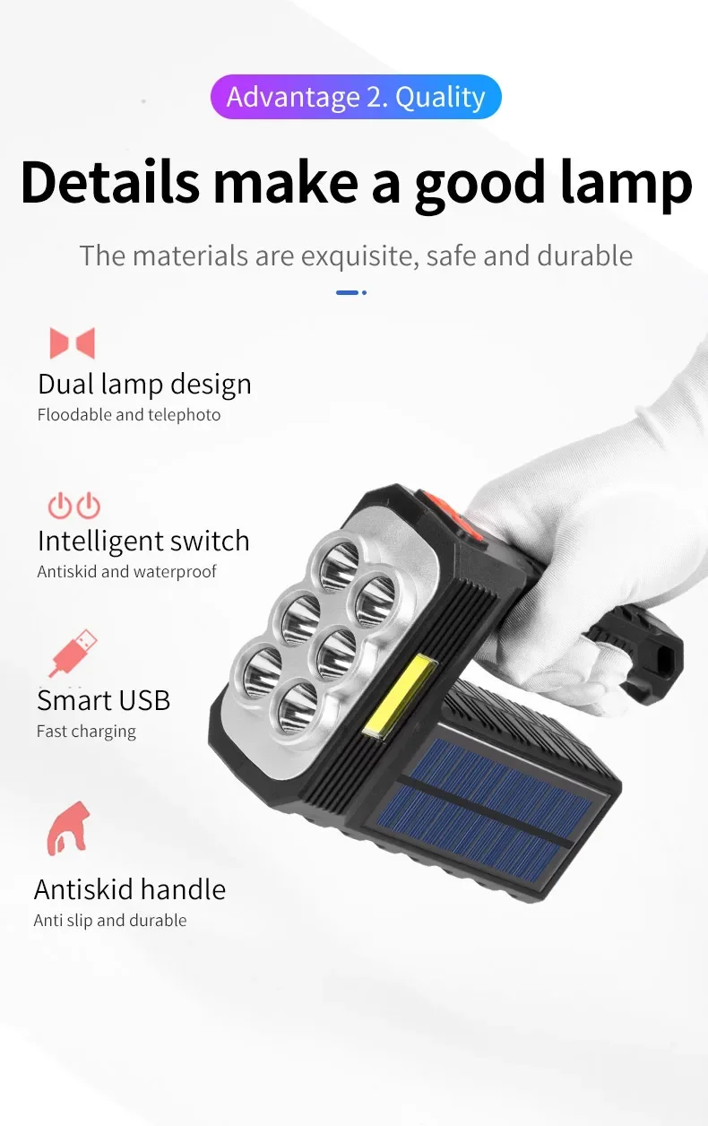 2.CHARGE SOLAIRE ET CHARGE USB :Notre lampe de poche dispose de deux modes de charge : Charge solaire et Charge USB.Charge solaire : équipé de panneaux solaires, tant qu'il y a une faible lumière du soleil, il peut être chargé rapidement à tout moment.Charge USB : il y a un port de chargement USB Android sur le côté de la lampe de poche, qui peut être connecté à un ordinateur, une voiture et une prise de courant.