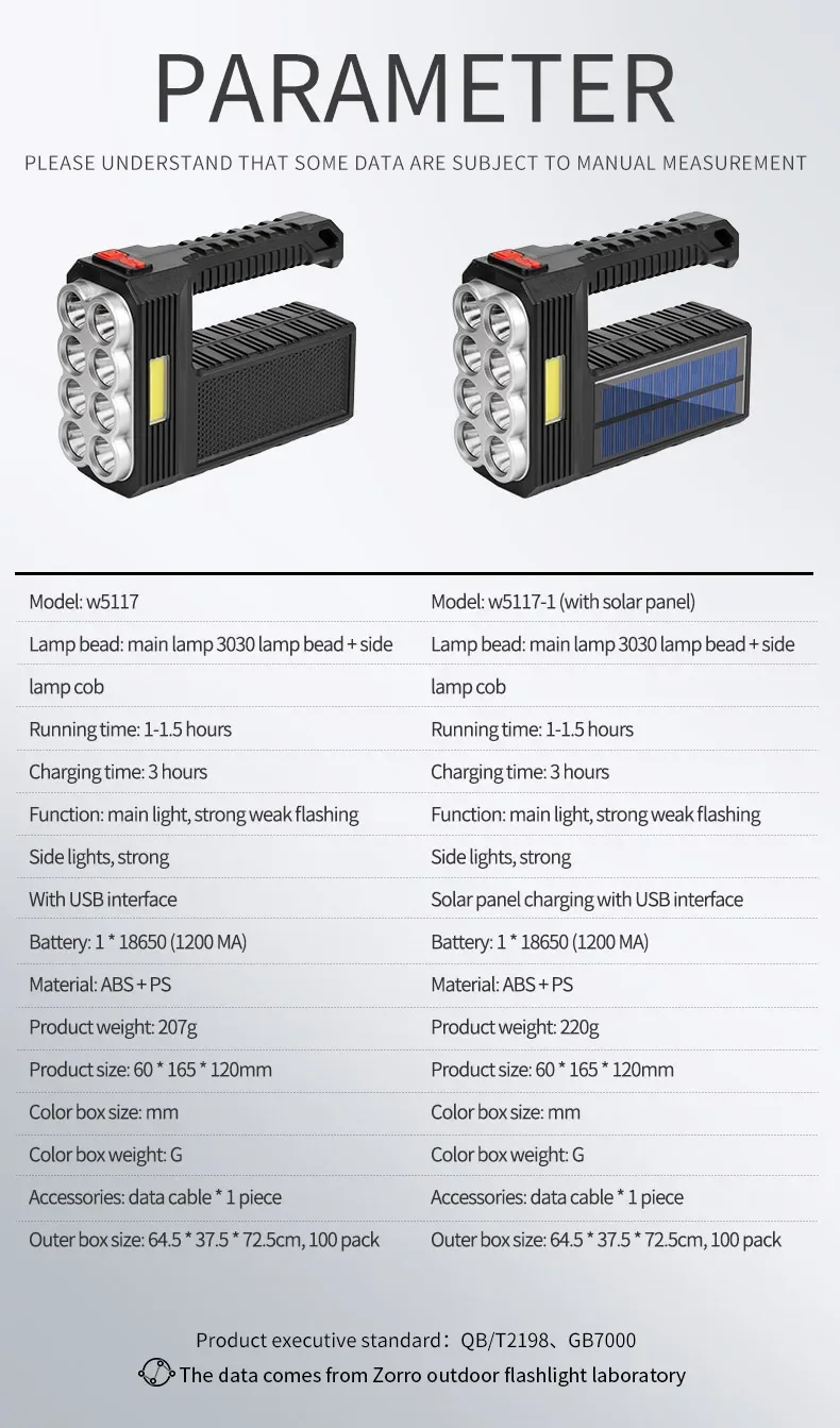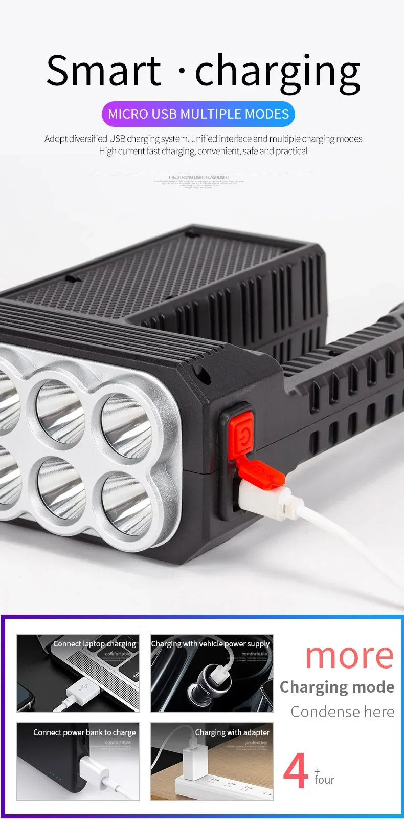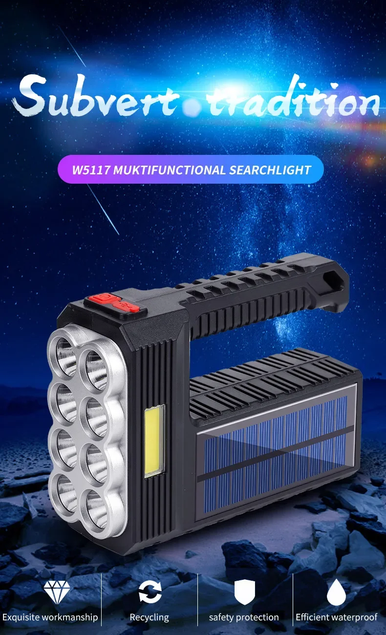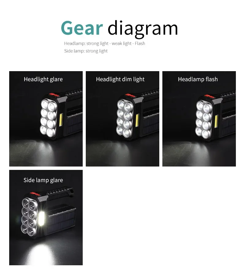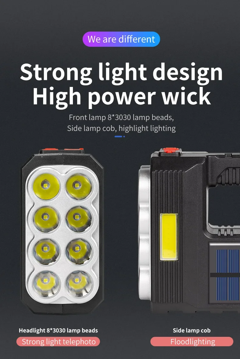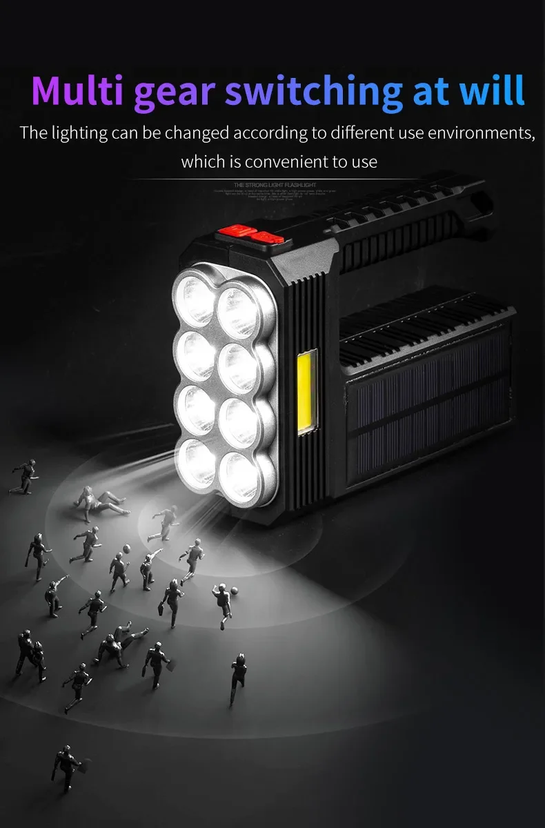 2.CHARGE SOLAIRE ET CHARGE USB :Notre lampe de poche dispose de deux modes de charge : Charge solaire et Charge USB.Charge solaire : équipé de panneaux solaires, tant qu'il y a une faible lumière du soleil, il peut être chargé rapidement à tout moment.Charge USB : il y a un port de chargement USB Android sur le côté de la lampe de poche, qui peut être connecté à un ordinateur, une voiture et une prise de courant.