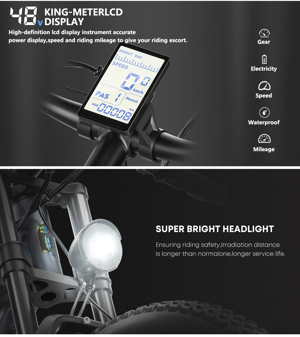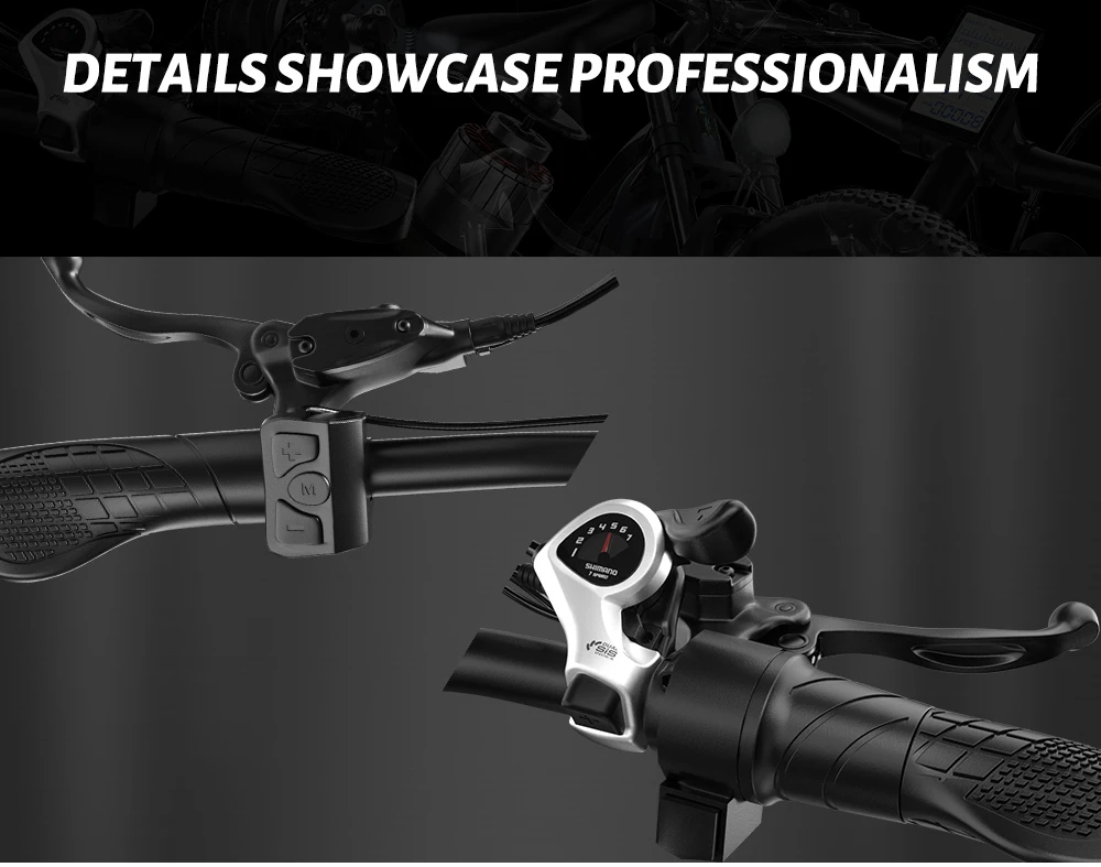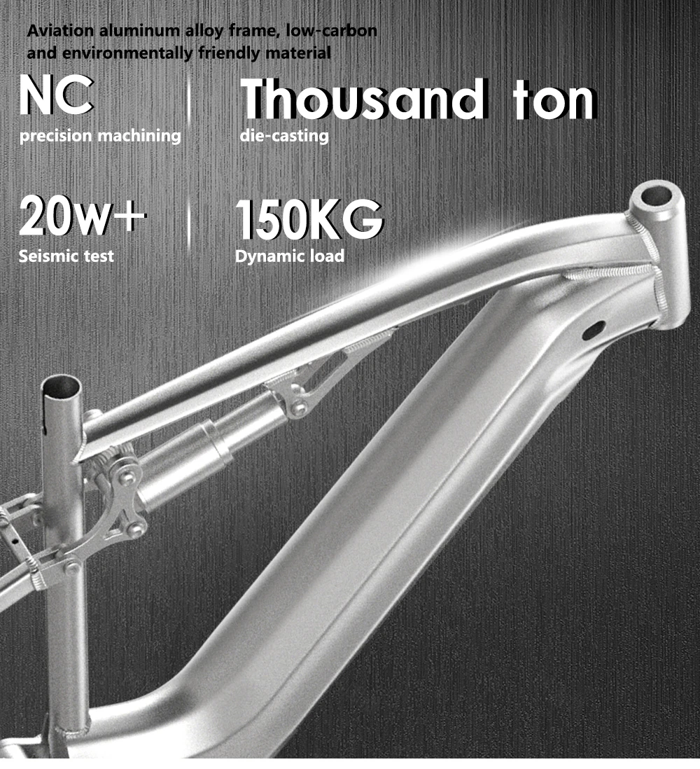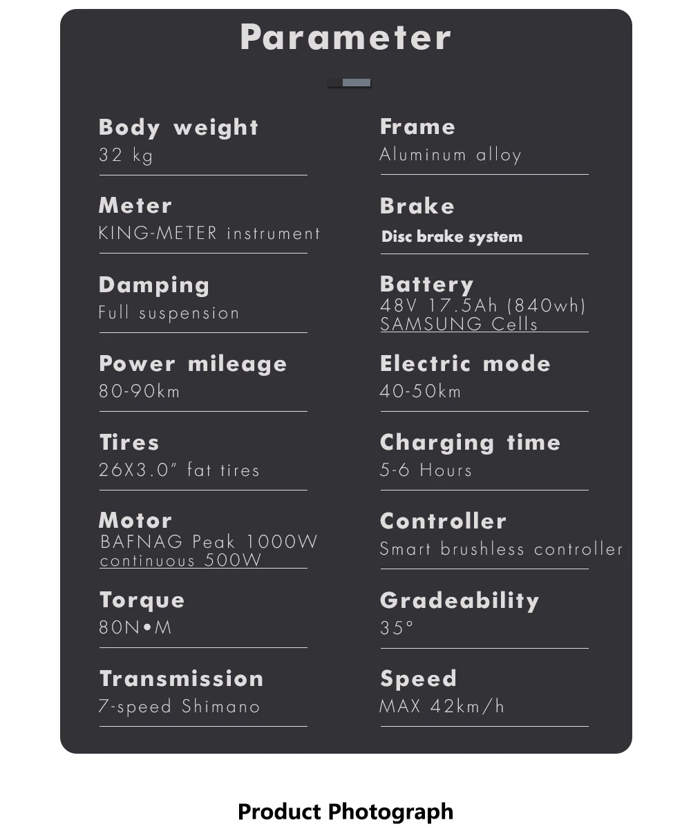 Charger model: determined according to the national standard of the sales location Charging time: 5-6 hours Range: pure electric 40-50 kilometers, assisted by 50-60 kilometers (weight 60KG, results of room temperature test) Motor: 1000W brushless motor Motor power: 48V1000W Maximum speed: 42km/h Transmission level: 7-speed Instrument screen: Jinmit 3.5-inch LCD large instrument (waterproof line) Tire specifications: 26X3.0 wide tyre Frame material: All aluminum alloy body, with a 26 inch body size Handlebar material: aluminum alloy Seat tube material: Height adjustable range 80-100cm (aluminum alloy) Front fork material: aluminum alloy material, lockable front fork Front fork shock absorption: dual shock absorption with front and rear springs (front shock absorption is a speed drop double shoulder shock absorber) Mid mounted shock absorber: link suspension shock absorber Brake type: intelligent power off disc brake system Transmission: Shimano, TX55/7-speed rear pull Chain: Special anti rust chain for electric bicycles