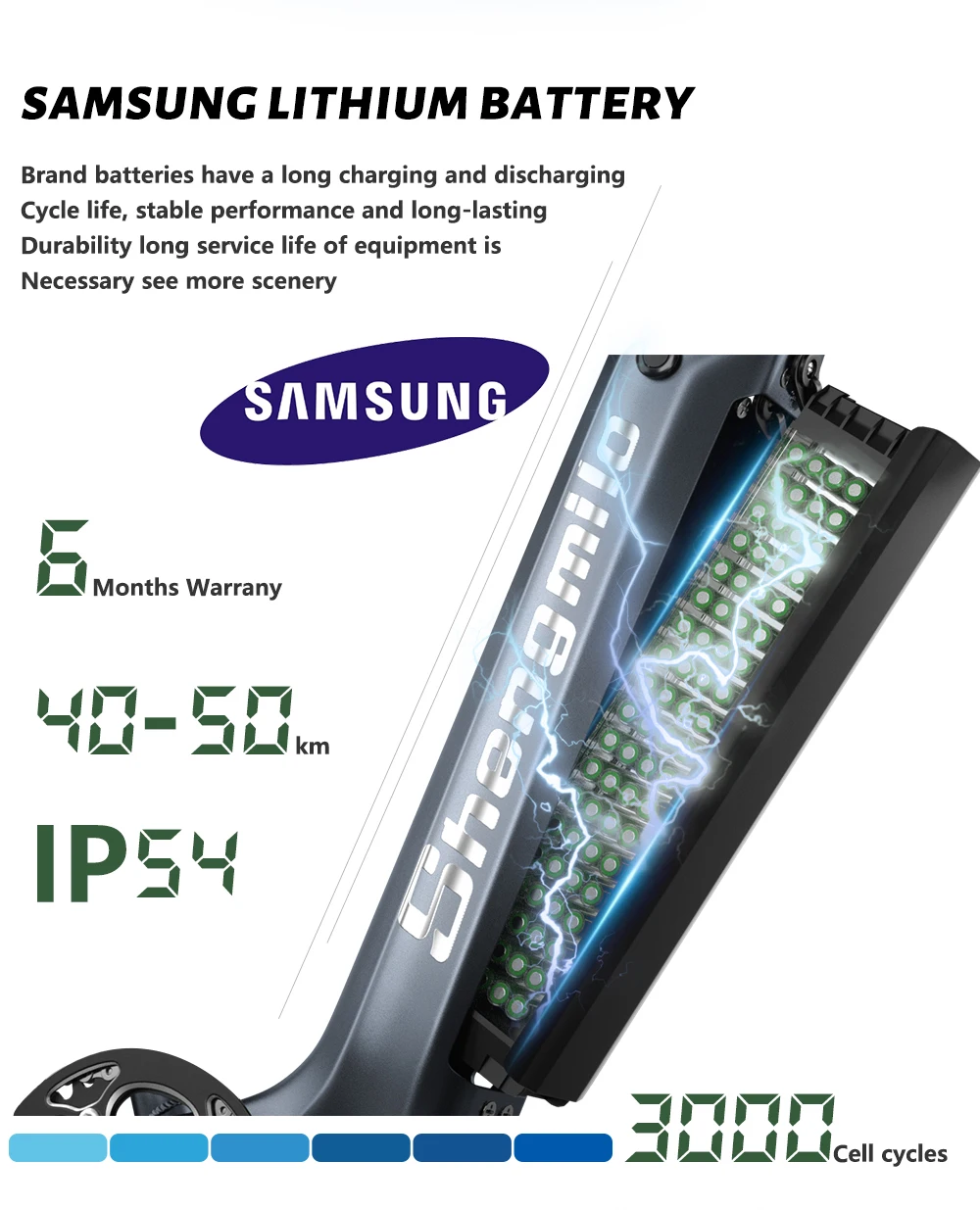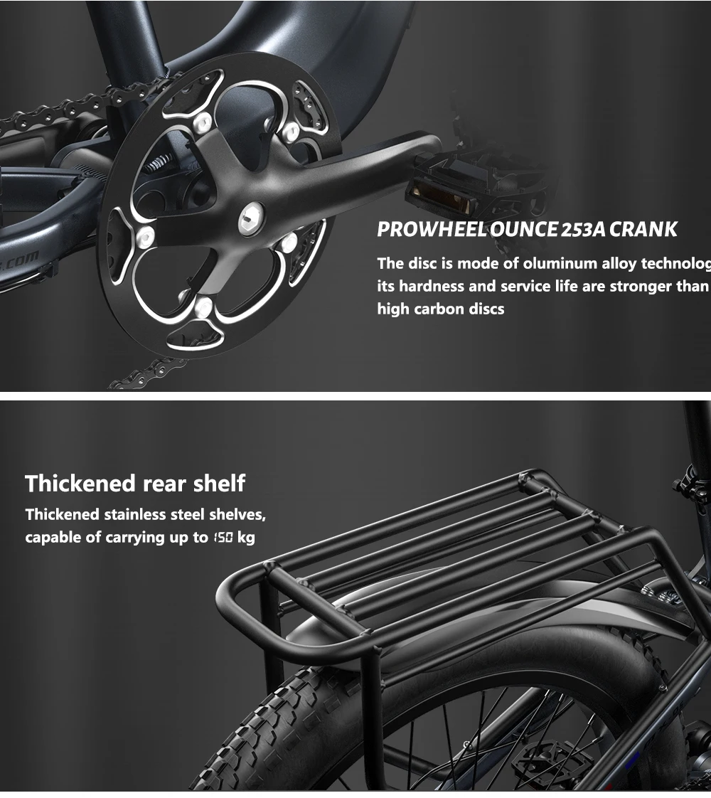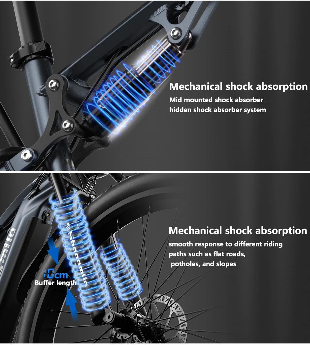 Charger model: determined according to the national standard of the sales location Charging time: 5-6 hours Range: pure electric 40-50 kilometers, assisted by 50-60 kilometers (weight 60KG, results of room temperature test) Motor: 1000W brushless motor Motor power: 48V1000W Maximum speed: 42km/h Transmission level: 7-speed Instrument screen: Jinmit 3.5-inch LCD large instrument (waterproof line) Tire specifications: 26X3.0 wide tyre Frame material: All aluminum alloy body, with a 26 inch body size Handlebar material: aluminum alloy Seat tube material: Height adjustable range 80-100cm (aluminum alloy) Front fork material: aluminum alloy material, lockable front fork Front fork shock absorption: dual shock absorption with front and rear springs (front shock absorption is a speed drop double shoulder shock absorber) Mid mounted shock absorber: link suspension shock absorber Brake type: intelligent power off disc brake system Transmission: Shimano, TX55/7-speed rear pull Chain: Special anti rust chain for electric bicycles
