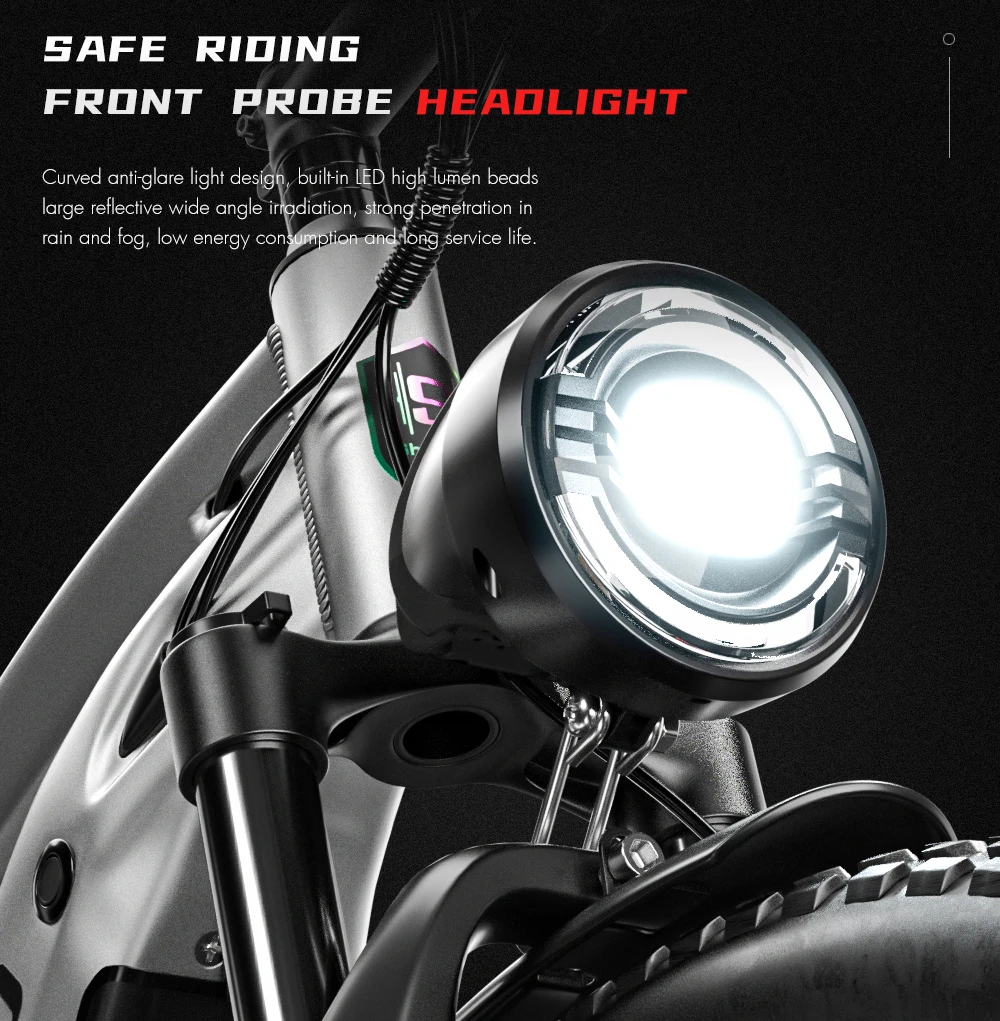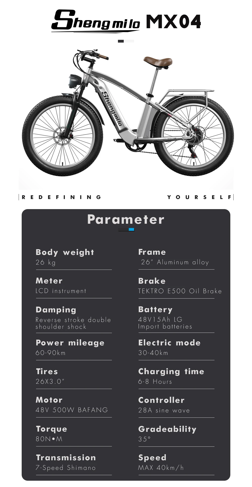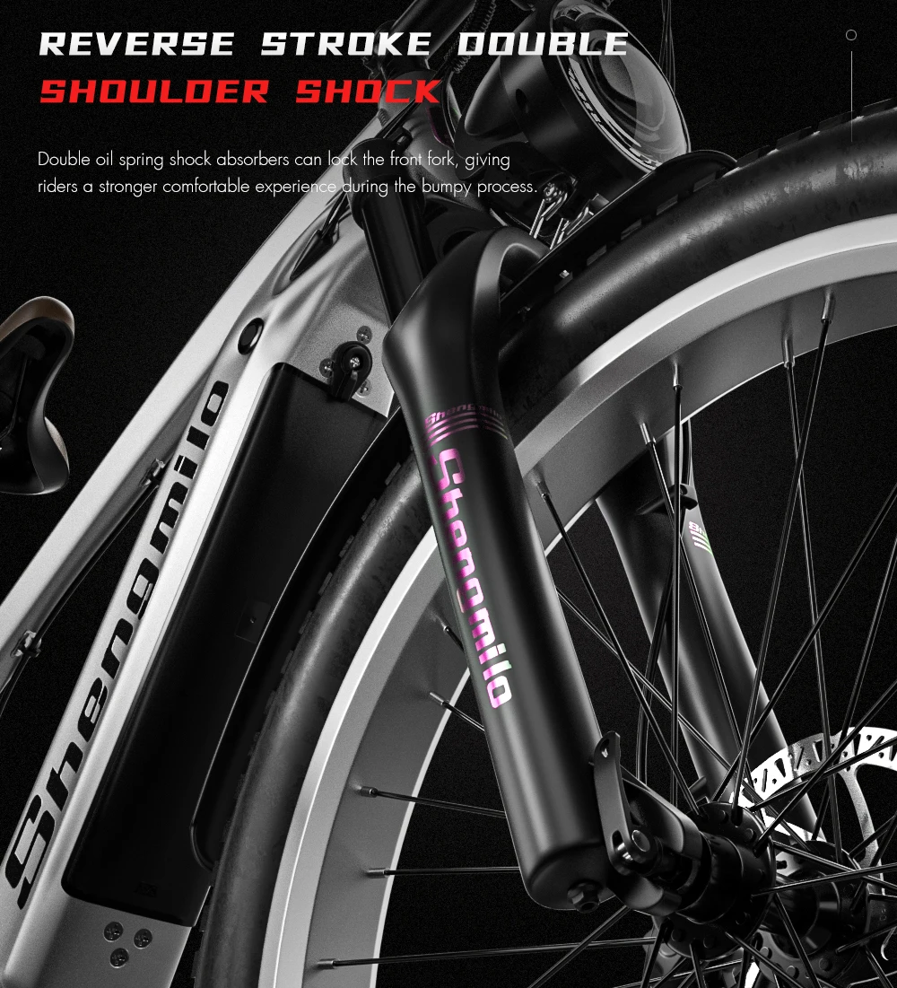 Charger model: determined according to the national standard of the sales location Charging time: 6-8 hours Range: pure electric 40-50 kilometers, assisted by 50-60 kilometers (weight 60KG, results of room temperature test) Motor: 1000W brushless motor Motor power: 48V 1000W Maximum speed: 42km/h Transmission level: 7-speed Instrument screen: Jinmit 3.5-inch LCD large instrument (waterproof line) Tire specifications: 26X3.0 wide tyre Frame material: All aluminum alloy body, with a 26 inch body size Handlebar material: aluminum alloy Seat tube material: Height adjustable range 80-100cm (aluminum alloy) Front fork material: aluminum alloy material, lockable front fork Front fork shock absorption: front spring dual shock absorber Mid mounted shock absorber: link suspension shock absorber Brake type: intelligent power off disc brake system Transmission: Shimano, TX55/7-speed rear pull Chain: Special anti rust chain for electric bicycles